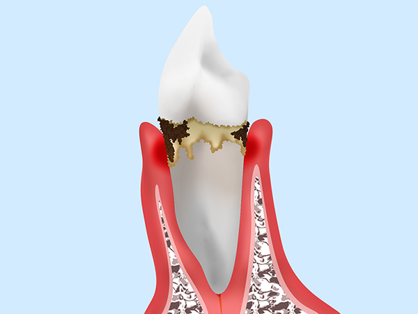 | 歯と歯ぐきの間の「歯周ポケット」にプラークなどの汚れが溜まり、歯周病の原因となる細菌が繁殖して炎症を引き起こします。歯ぐきが赤く腫れ、ブラッシング時に出血が見られることもあります。痛みなどはありません。 | |